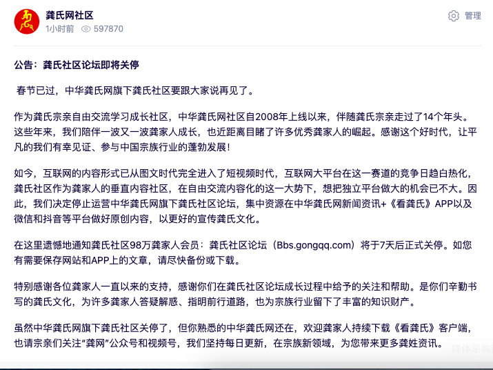 如今,互联网的内容形式已从图文时代完全进入了短视频时代,互联网大平台在这一赛道的竞争日趋白热化,龚氏社区作为龚家人的垂直内容社区,在自由交流内容化的这一大势下,想把独立平台做大的机会已不大。因此,我们决定停止运营中华龚氏网旗下龚氏社区论坛,集中资源在中华龚氏网新闻资讯+《看龚氏》APP以及微信和抖音等平台做好原创内容,以更好的宣传龚氏文化。