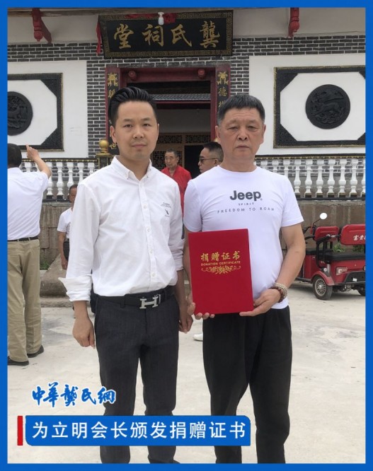 最后长沙市跳马龚氏宗亲联合会会长龚立明代表长沙市跳马龚氏支持中华龚氏网为龚家文化传承宣传做的贡献,现场向龚氏网捐款2000元,并且希望中华龚氏网团队牢记传承和弘扬中国传统文化的使命。