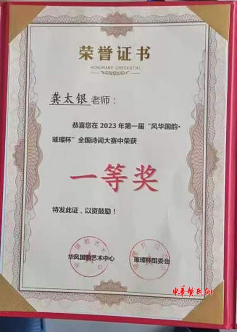 龚太银秘书长参加“风华国韵璀璨”杯全国诗词大赛,喜获一等奖,可喜可贺!