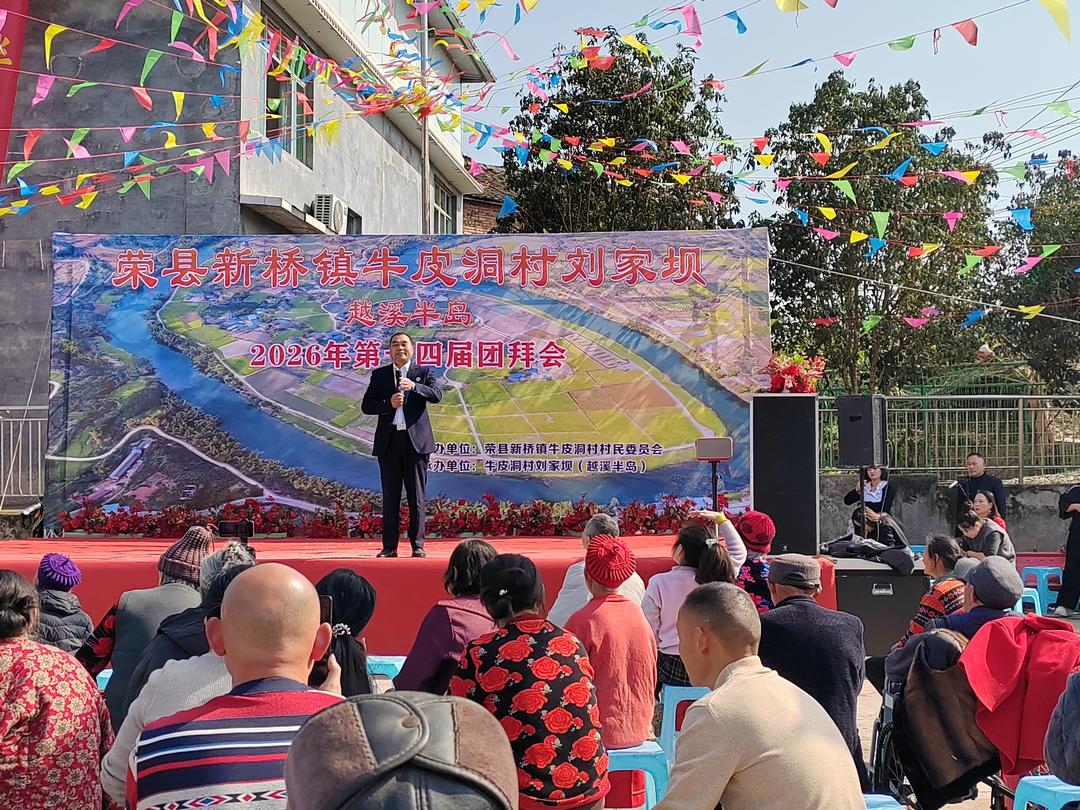 中华龚氏网四川电(唐克丽)2026年2月13日,四川省自贡市荣县新桥镇牛皮洞村刘家坝越溪半岛阳光明媚、春意融融。刘家坝第十四届团拜会在此隆重举行。村民乡亲、返乡游子与各界嘉宾齐聚一堂,共叙乡情、共话发展、共谋未来,为新春乡村振兴注入蓬勃活力。